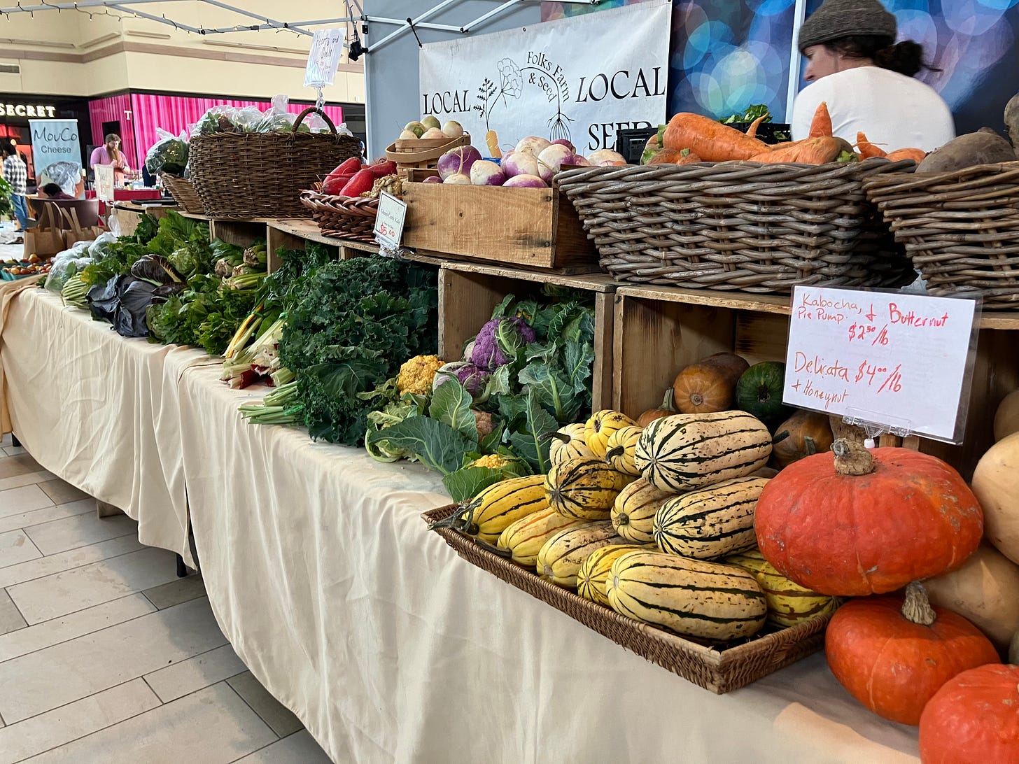 While setting up for the market our 16-foot stall feels small. We have such an abundance of crops for this late in the year. It all barely fit in the booth, and we forgot potatoes and red onions at the farm!